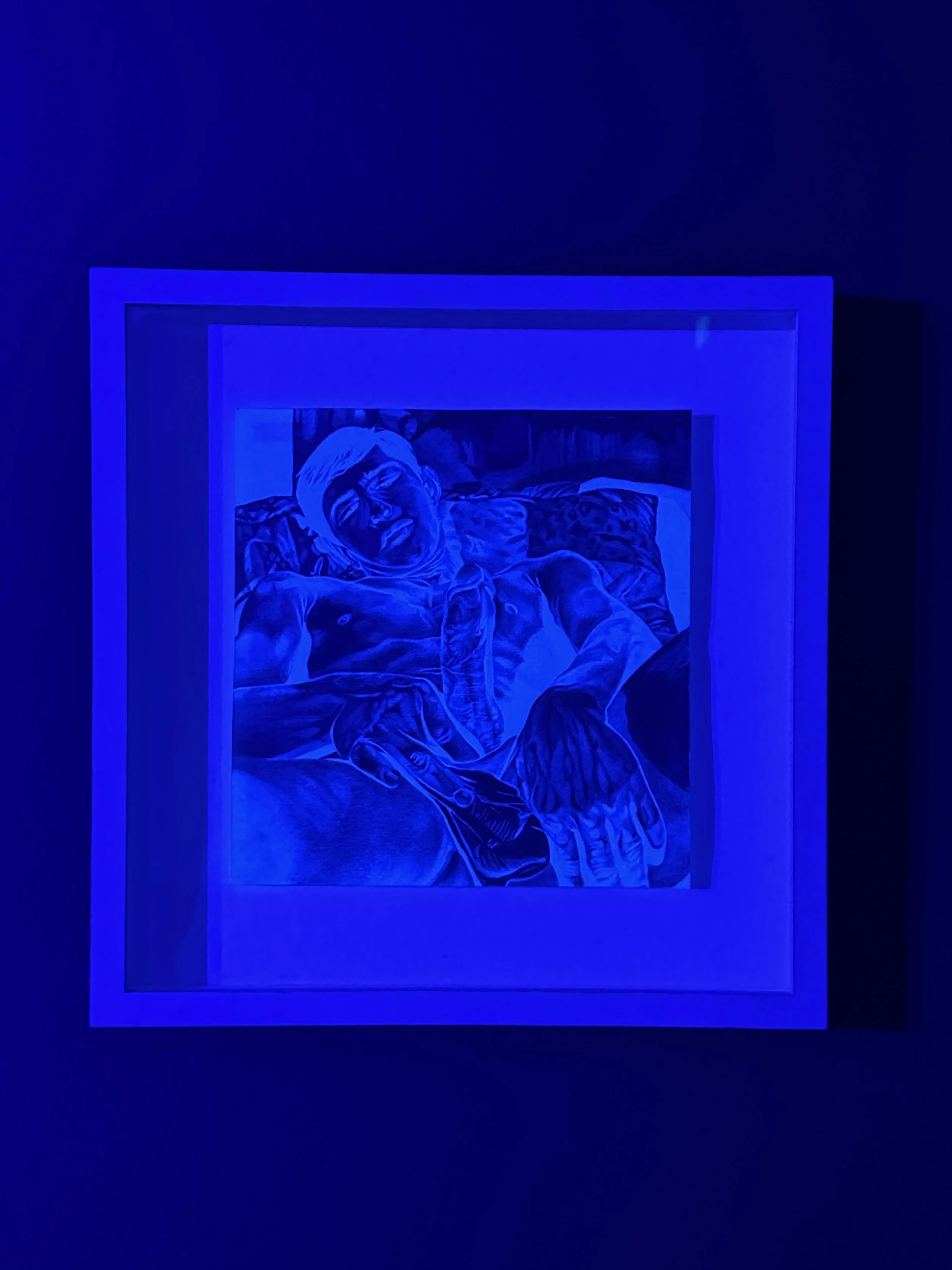 Breaking the boundaries of graphite, Brandenburg accompanies his meticulous drawings with backlighting and dark walls to create the hedonistic atmosphere of a Berlin club. Eyes 5cm from his drawings, his skill is almost unbelievable.