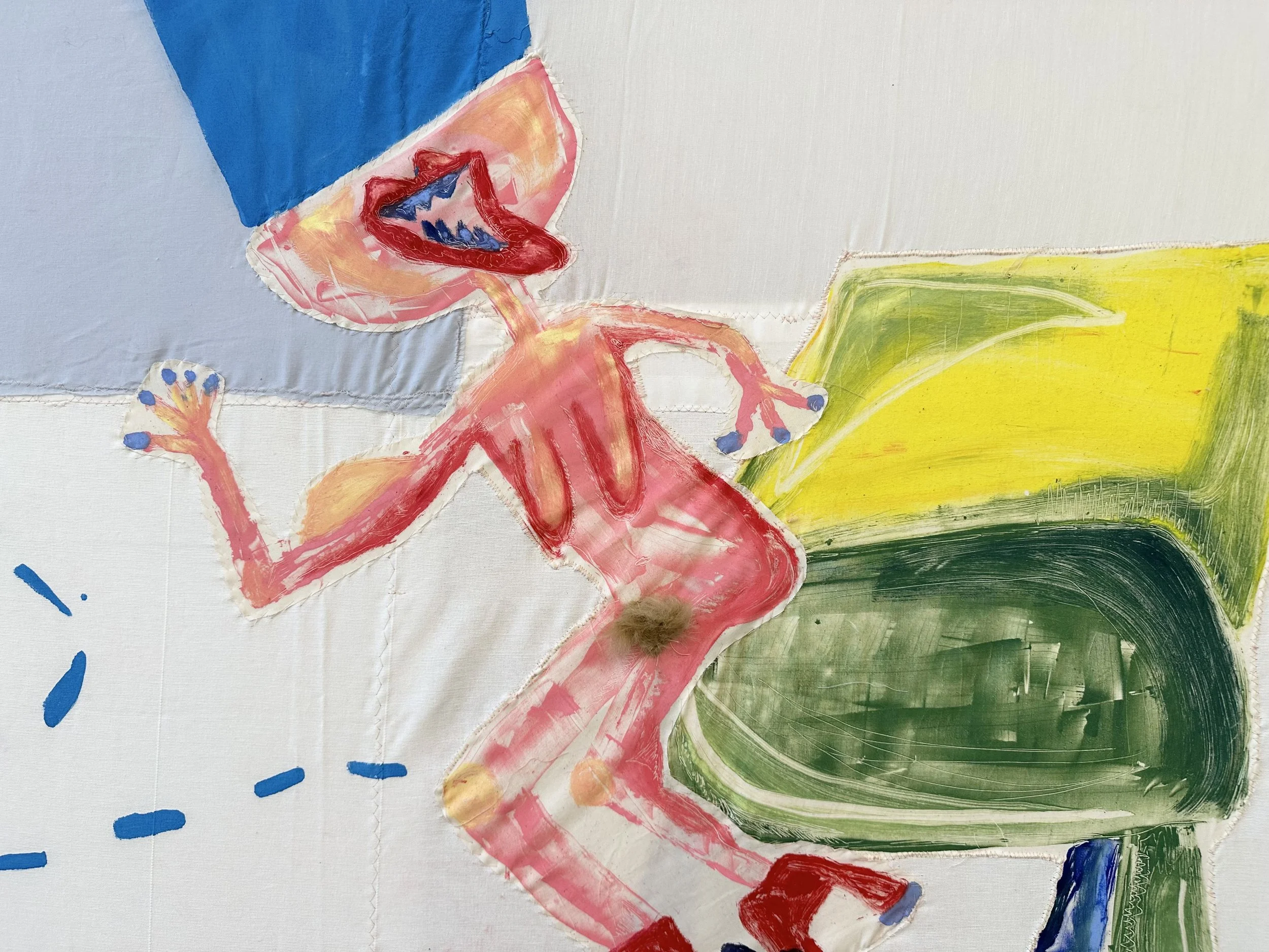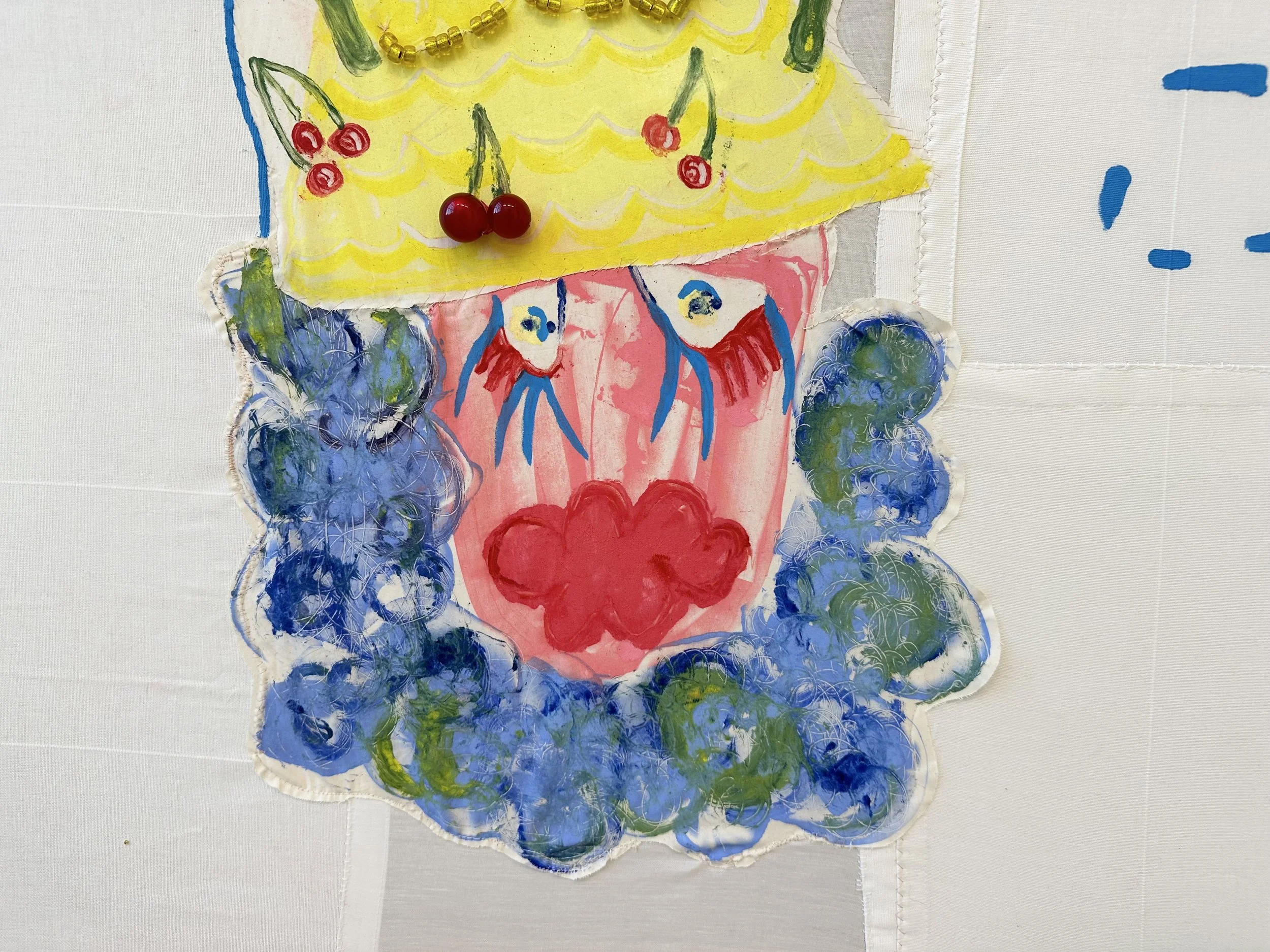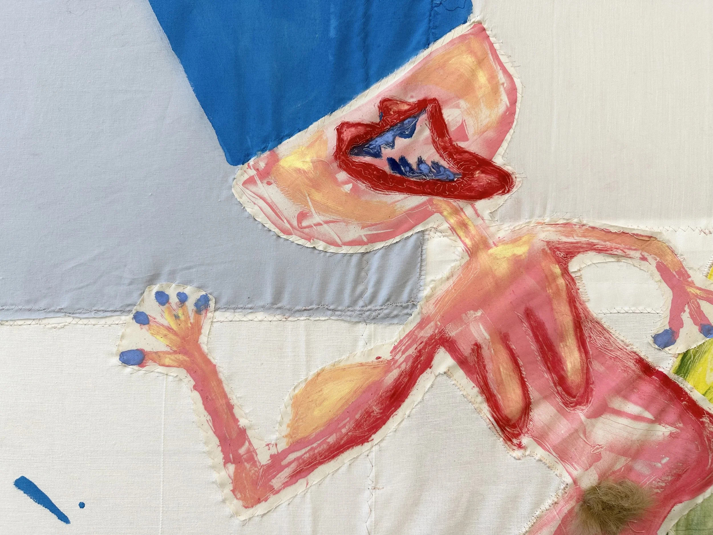 Cake is my APHRODISIAC!!!, monotype on cotton, acrylic, fur and beads machine stitched together, 180 x 120 cm