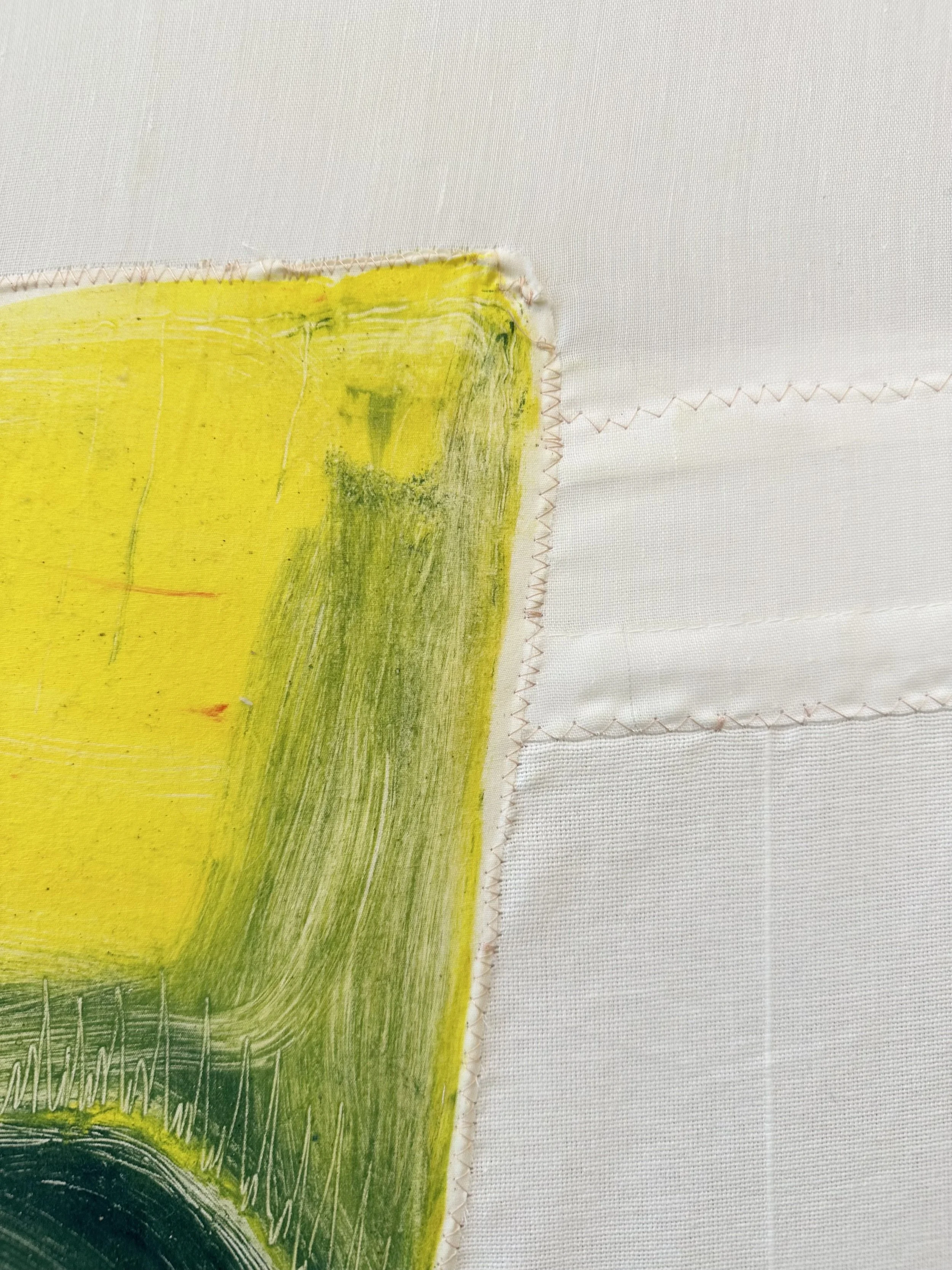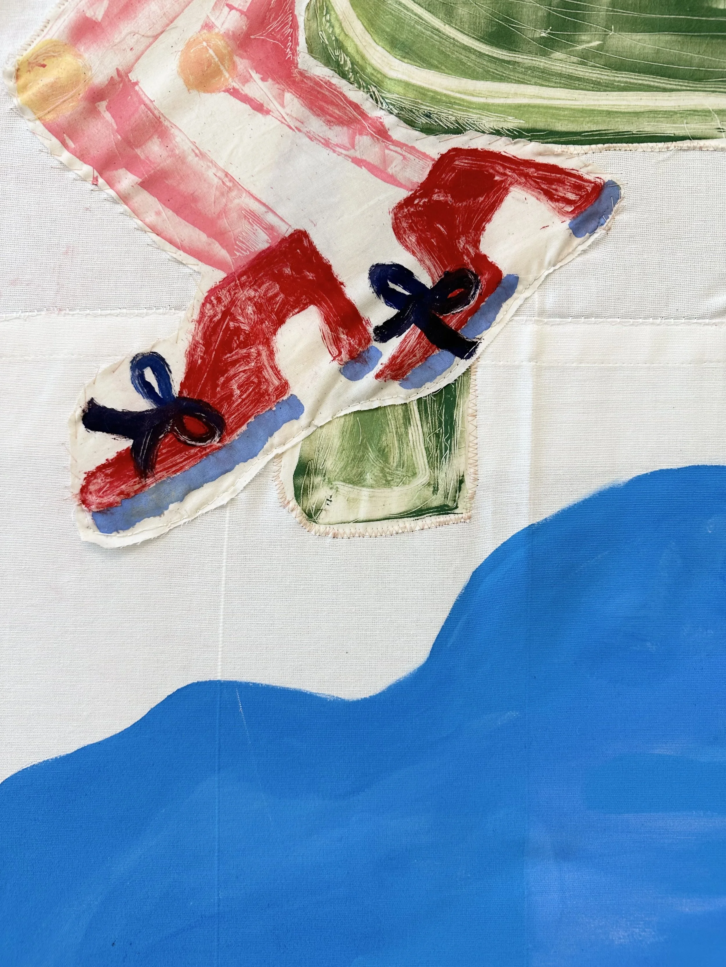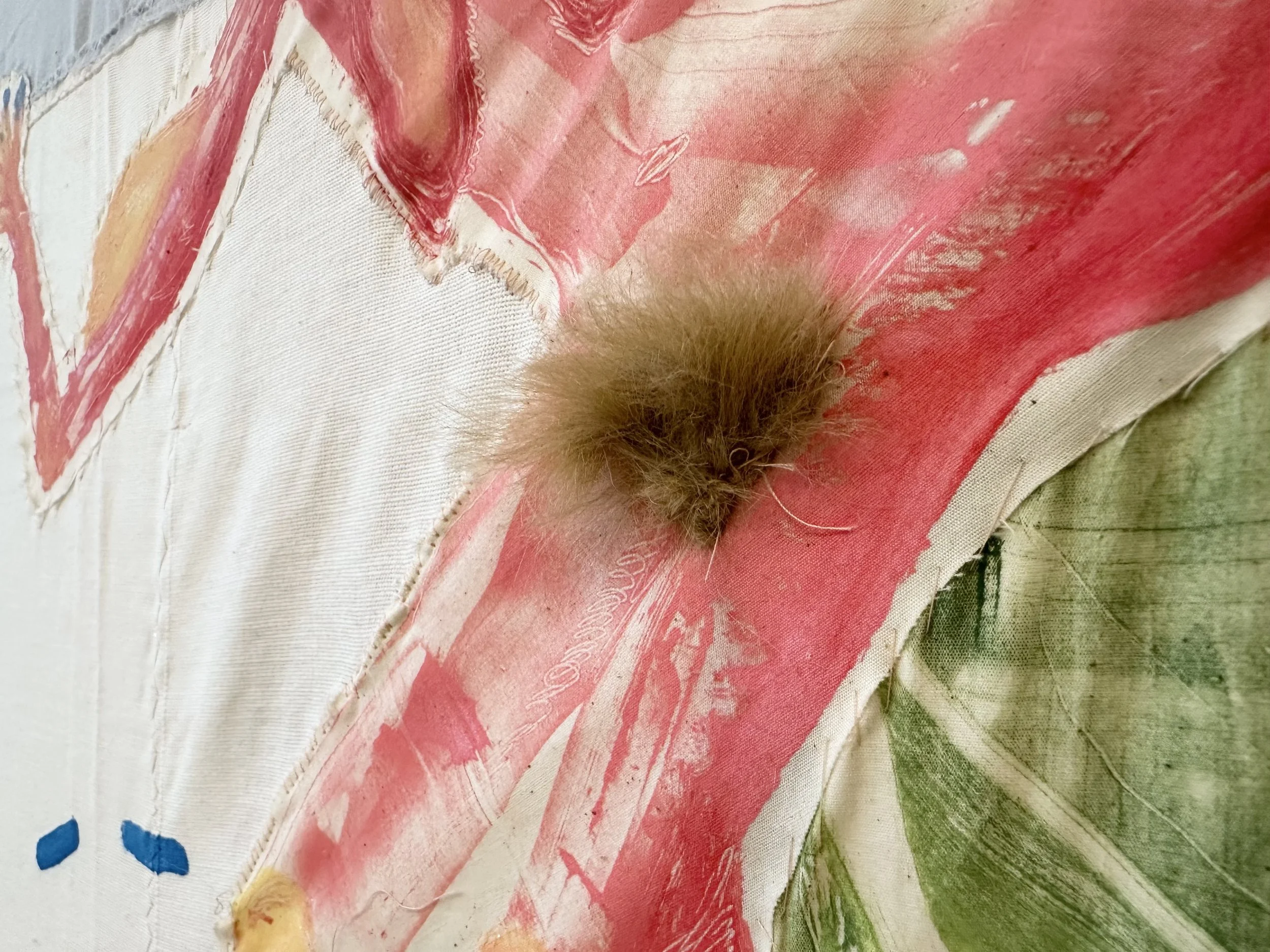Cake is my APHRODISIAC!!!, monotype on cotton, acrylic, fur and beads machine stitched together, 180 x 120 cm