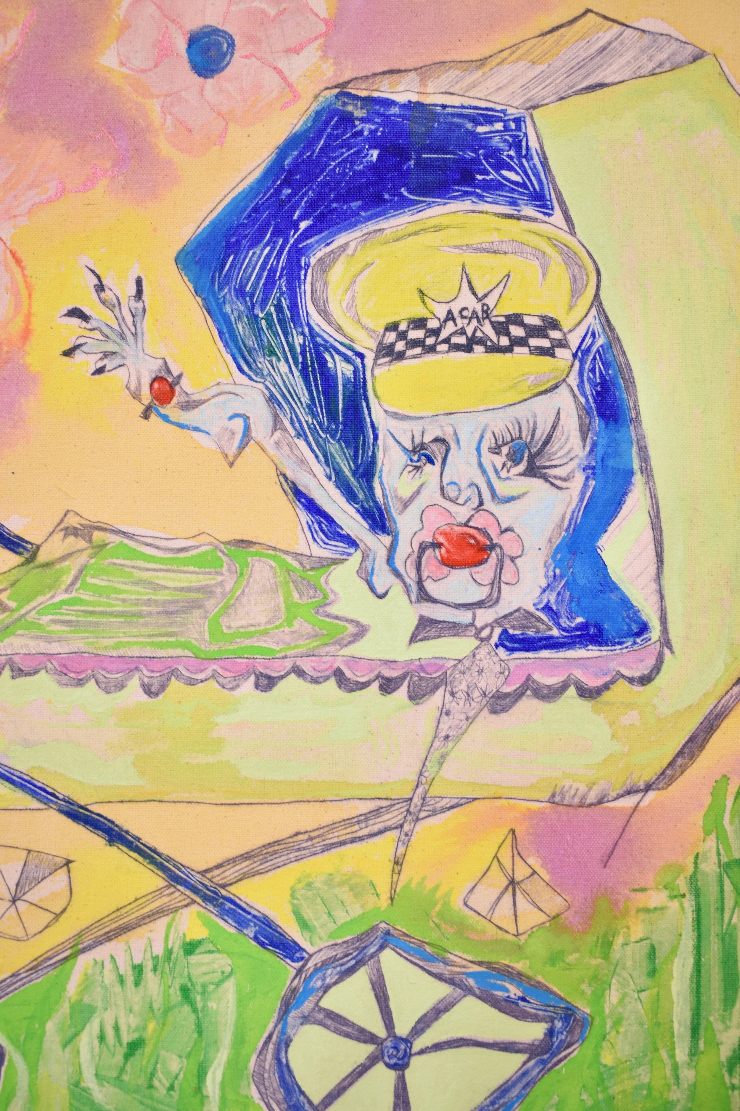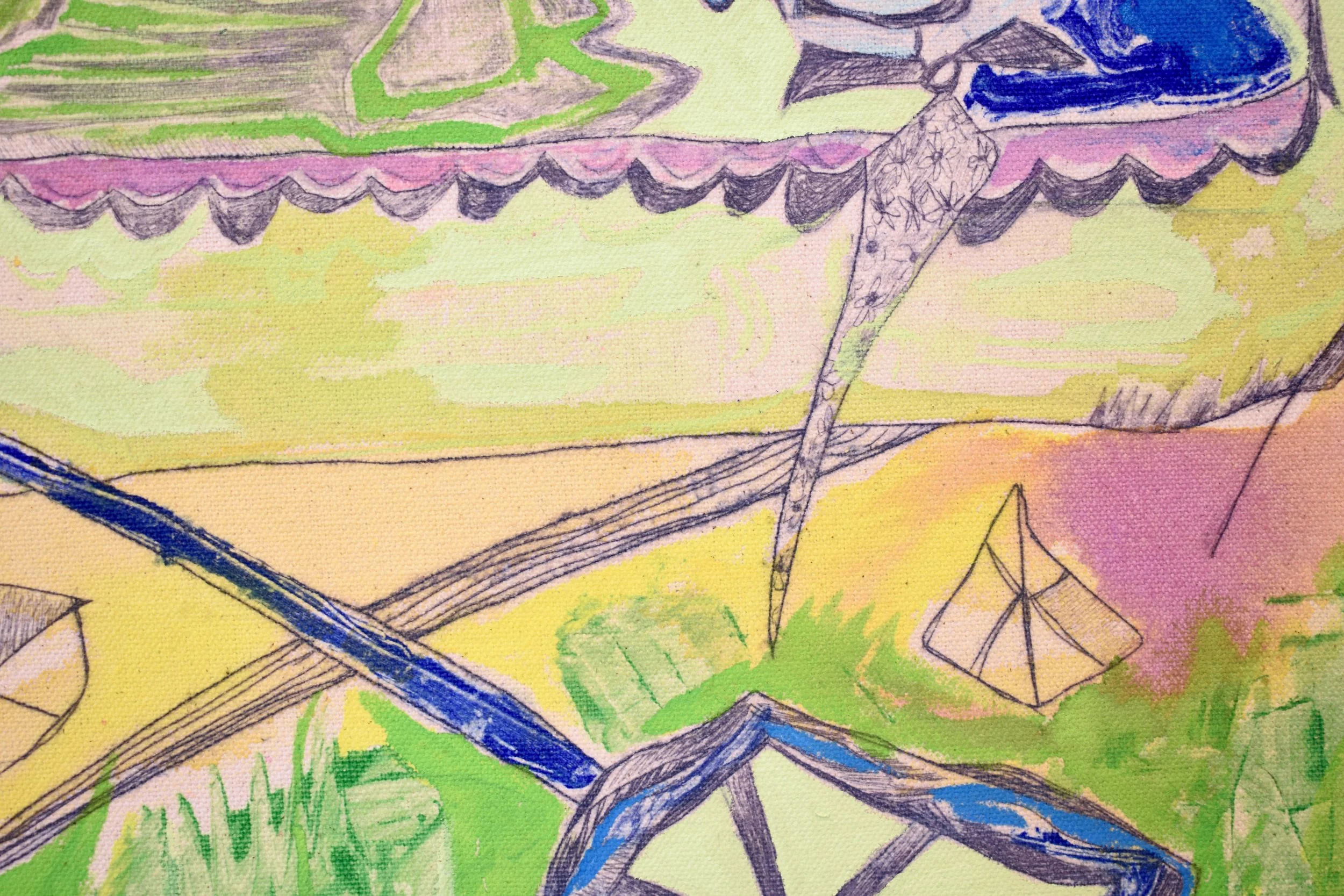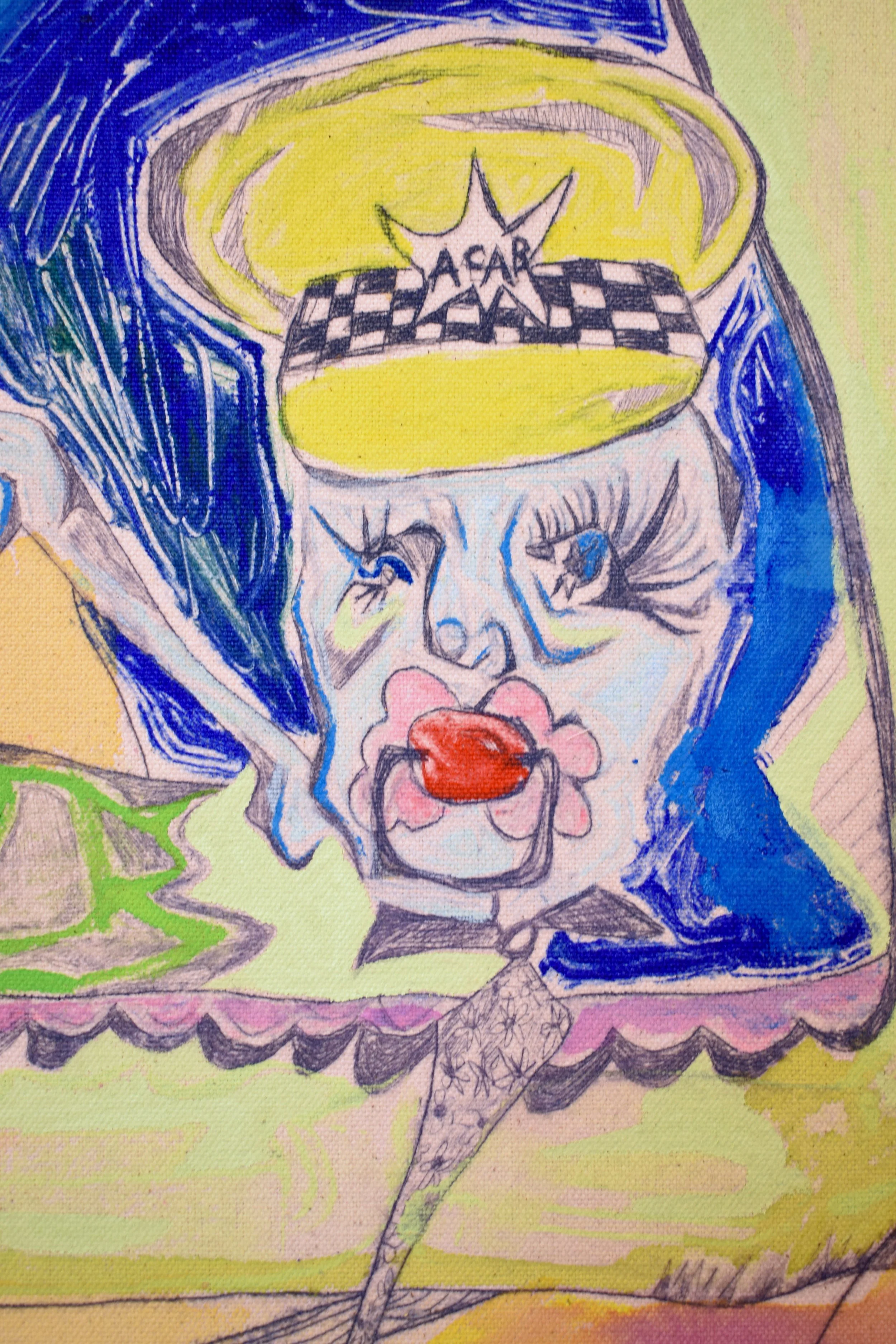 Policed from birth I (2025), stretched drypoint etching on canvas with acrylic and ink detailing, 62 x 43cm