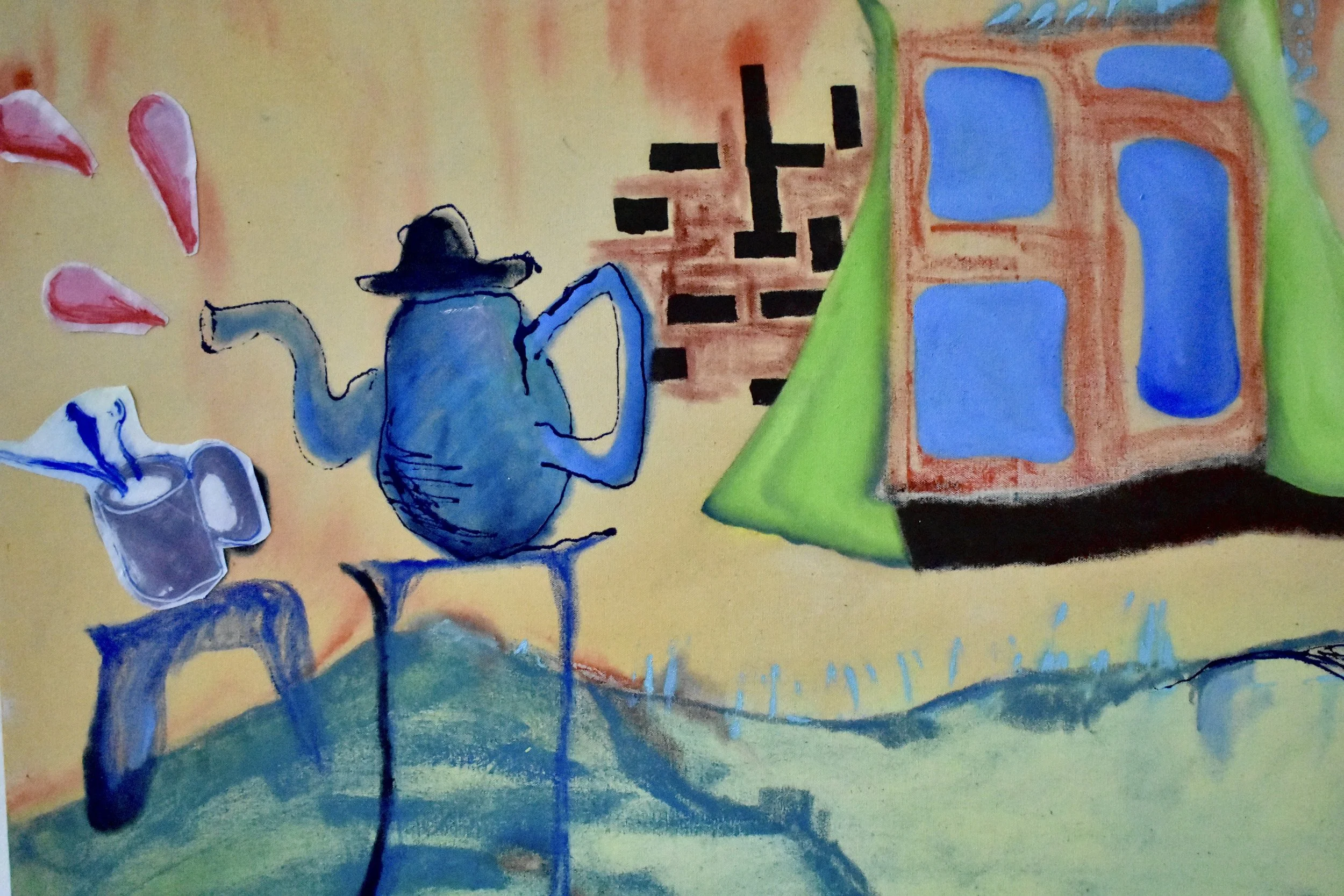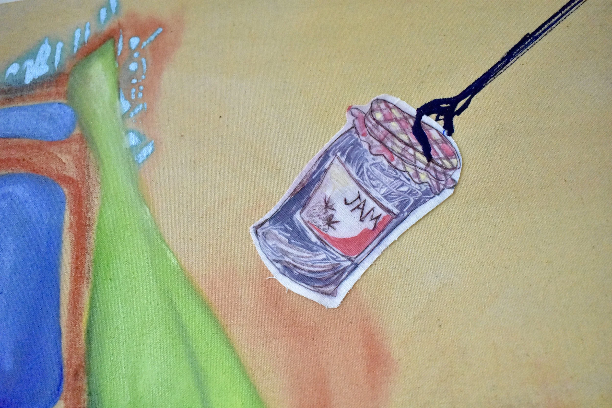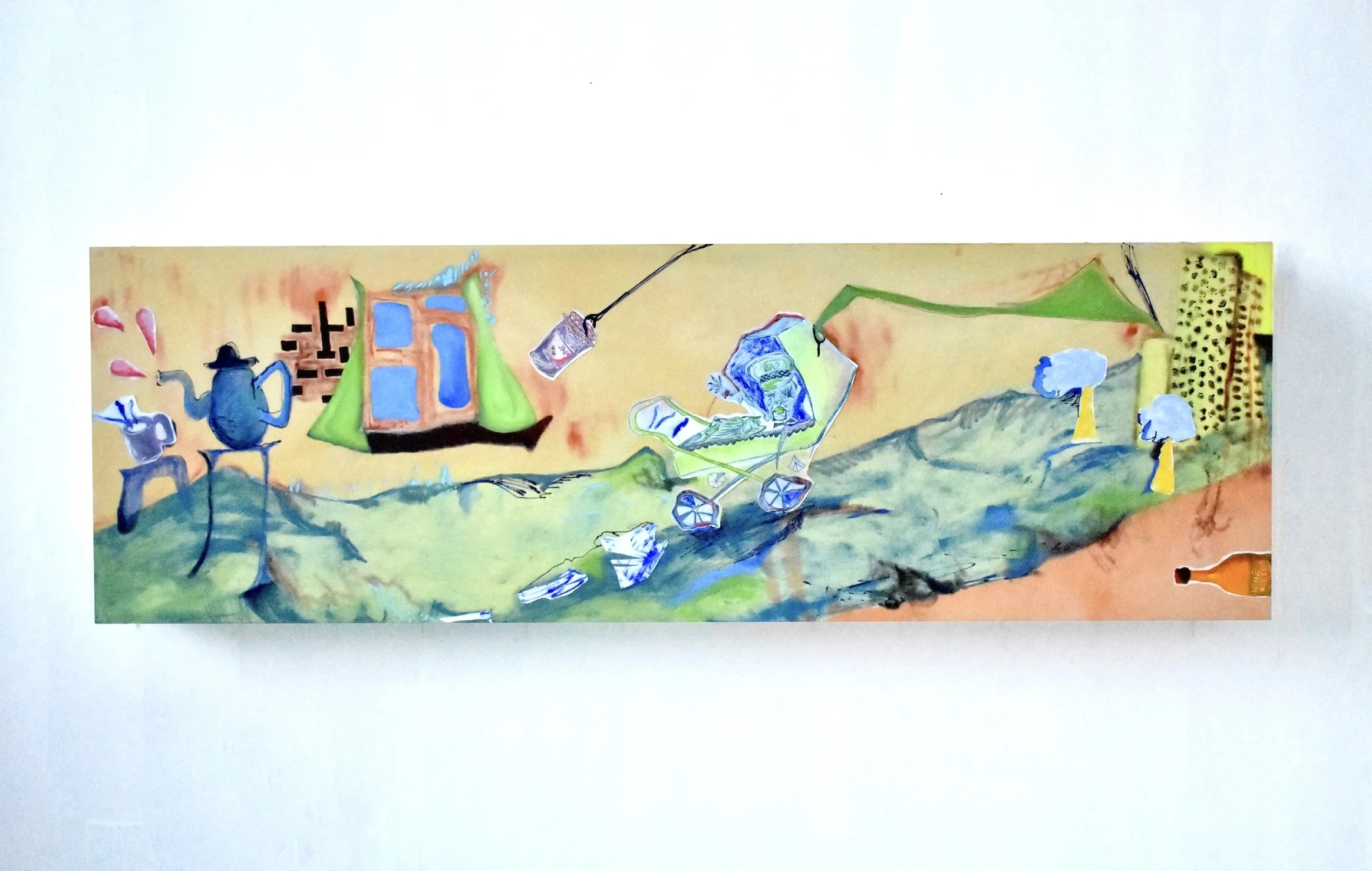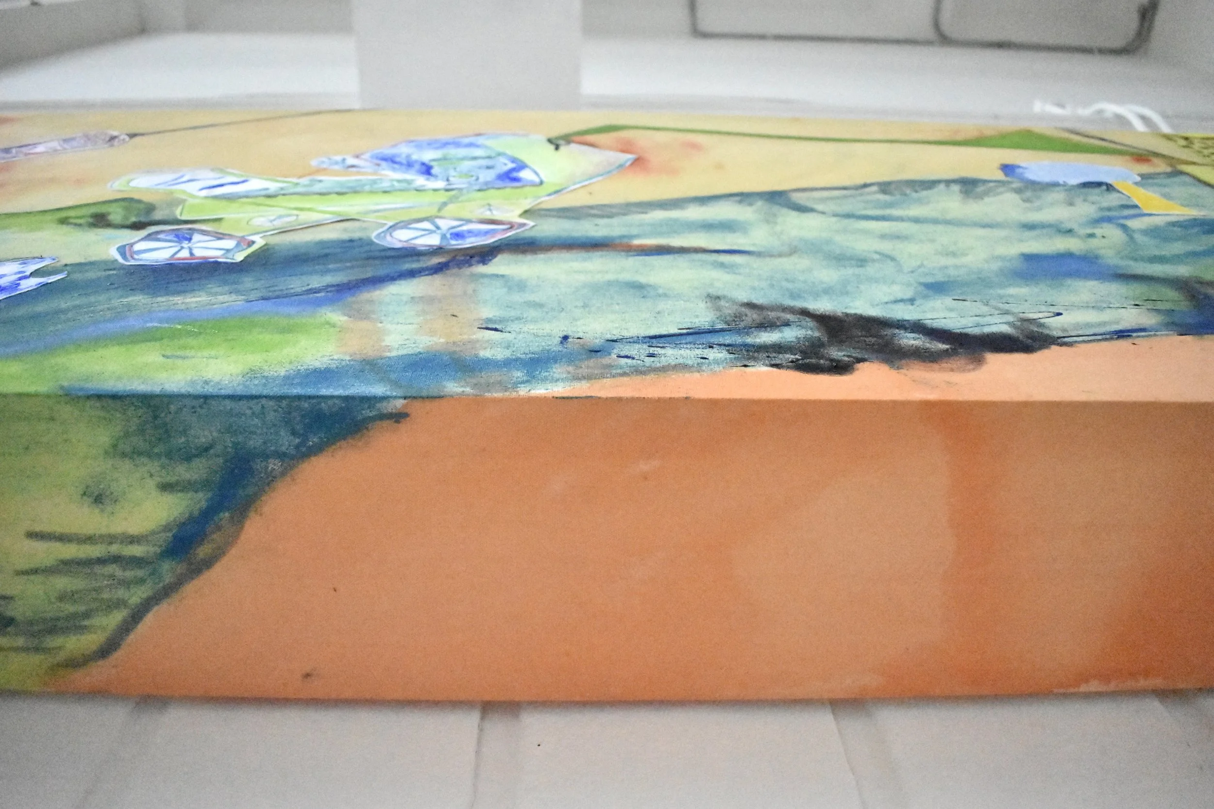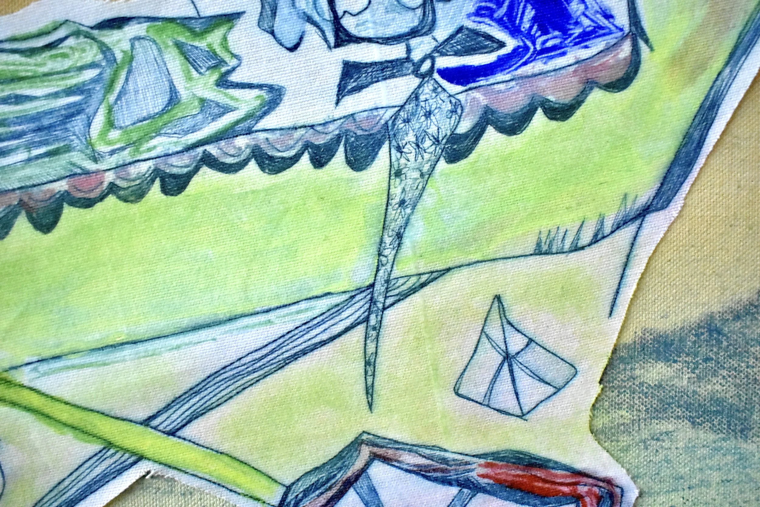 Reproductive rights are BURNING ALIVE (2025), acrylic and oil paint on canvas with collaged monotype prints on cotton and drypoint etchings on cotton, 250 x 80 x 30 cm